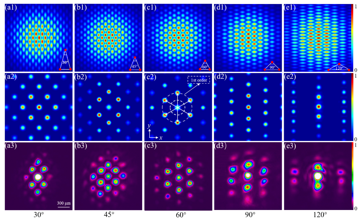 图2 (a1-e1) 理论模拟六角耦合场。(a1) 30°, (b1) 45°, (c1) 60°, (d1) 90°, (e1) 120°。(a2-e2) 为