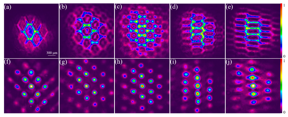 进一步地,基于电磁诱导透明效应的各种相干控制技术,通过对该系统施加光场特性的改变,探测光所感受到的原子介质折射率可以被周期性地进行调制,从而改变其晶格点的调制深度。根据研究团队之前工作的发现,当双光子失谐Δ由负值变为正值时,其折射率发生反转,尽管其剖面一直呈现出蜂巢晶格的轮廓,但其对应的探测光衍射图样会呈现出蜂巢型到六角型的演变 [Opt. Express 31(7), 11335-11343 (2023)]。为了更好地证明拉伸结构光子石墨烯的产生,同时避免由于在Δ < 0时,自散焦效应导致的远场衍射观测误差,研究团队在实验上分别观测了-15 MHz和15 MHz时该光子石墨烯不同几何结构的近场衍射图样。实验发现,在-15 MHz下,常规光子石墨烯输出的探测光束展示出一个清晰蜂巢轮廓。通过改变三束耦合光束空间排布,蜂巢状的衍射图案将会沿不同的方向拉伸;而15 MHz时的近场衍射变化与远场观测情况基本一致。该近场衍射现象进一步形象地表征了光子石墨烯几何结构的重构过程,增加了实验结论的可信性。因此,通过改变三束干涉耦合光的空间排布,可以实现任意拉伸程度的光子石墨烯。这种具有可重构几何结构的光子石墨烯为进一步研究光传输和谷霍尔效应铺平了道路。此外,研究人员还通过改变系统参数,例如,双光子失谐以及耦合光功率,动态调节光子石墨烯格点强度的分布,充分展现了该系统灵活的可调谐特性,为进一步研究原子系统中的量子信息处理和量子网络提供了理想的平台。