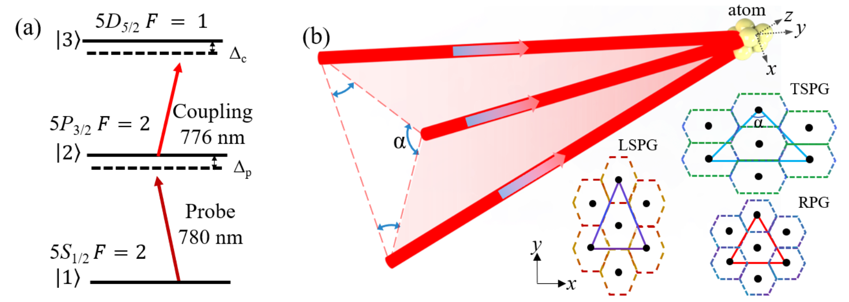 课题组近期于Frontiers of Physics发表文章“Photonic graphene with reconfigurable geometric structures in coherent atomic ensembles”,首次在相干三能级铷原子系统中实现了可重构几何结构的光子石墨烯,并对其可调谐特性进行系统的研究。研究人员首先利用电磁诱导透明效应和三光干涉技术在热原子介质中诱导出光子石墨烯,通过调节三束干涉耦合光场的空间排布,实现不同几何拉伸结构的光子石墨烯,并根据入射探测场的离散衍射图样来表征当前光子石墨烯的几何特征。